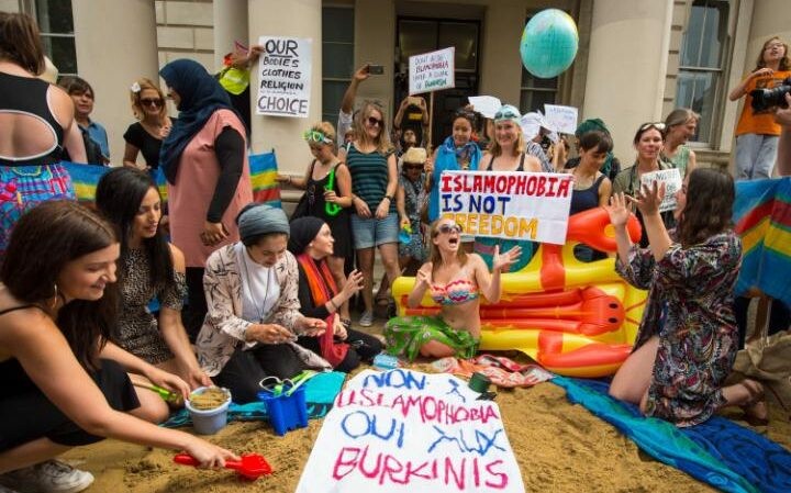 Φορώντας μπουρκίνι αλλά και μπικίνι, οι γυναίκες κάθισαν στην άμμο που είχαν ρίξει κι έπαιξαν με μπάλες μπροστά από την πρεσβεία, ενώ κάποιες εξ αυτών κρατούσαν πλακάτ όπου διάβαζε κανείς τα συνθήματα «η ισλαμοφοβία δεν είναι ελευθερία» και «αφήστε τις να φοράνε ό,τι θέλουν».