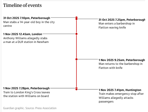 Σύμφωνα με τον Guardian, η Βρετανική Αστυνομία Μεταφορών (BTP) είχε ήδη ταυτοποιήσει τον Γουίλιαμς ως ύποπτο για προηγούμενη επίθεση με μαχαίρι στο δίκτυο του Λονδίνου, όμως δεν κατάφερε να τον εντοπίσει προτού ξεσπάσει το αιματηρό περιστατικό στο τρένο.