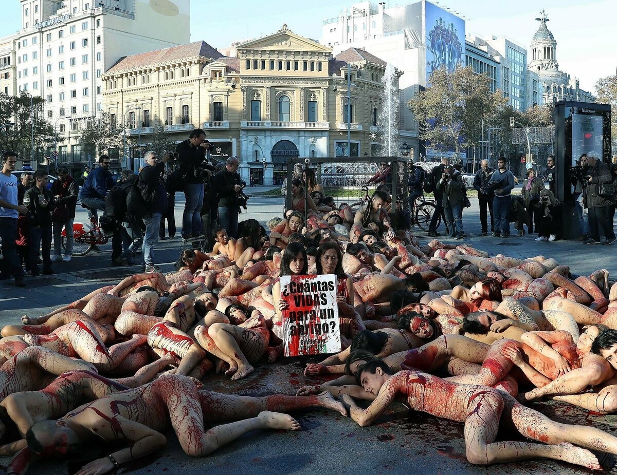 Δεκάδες γυμνοί διαδηλωτές συγκεντρώθηκαν σήμερα στο κέντρο της Βαρκελώνης για να διαμαρτυρηθούν για την κατασκευή ενδυμάτων από γούνα. Οι διαδηλωτές είχαν βάψει τα γυμνά τους σώματα με κόκκινη μπογιά, που αναπαριστούσε το αίμα και φώναζαν συνθήματα.