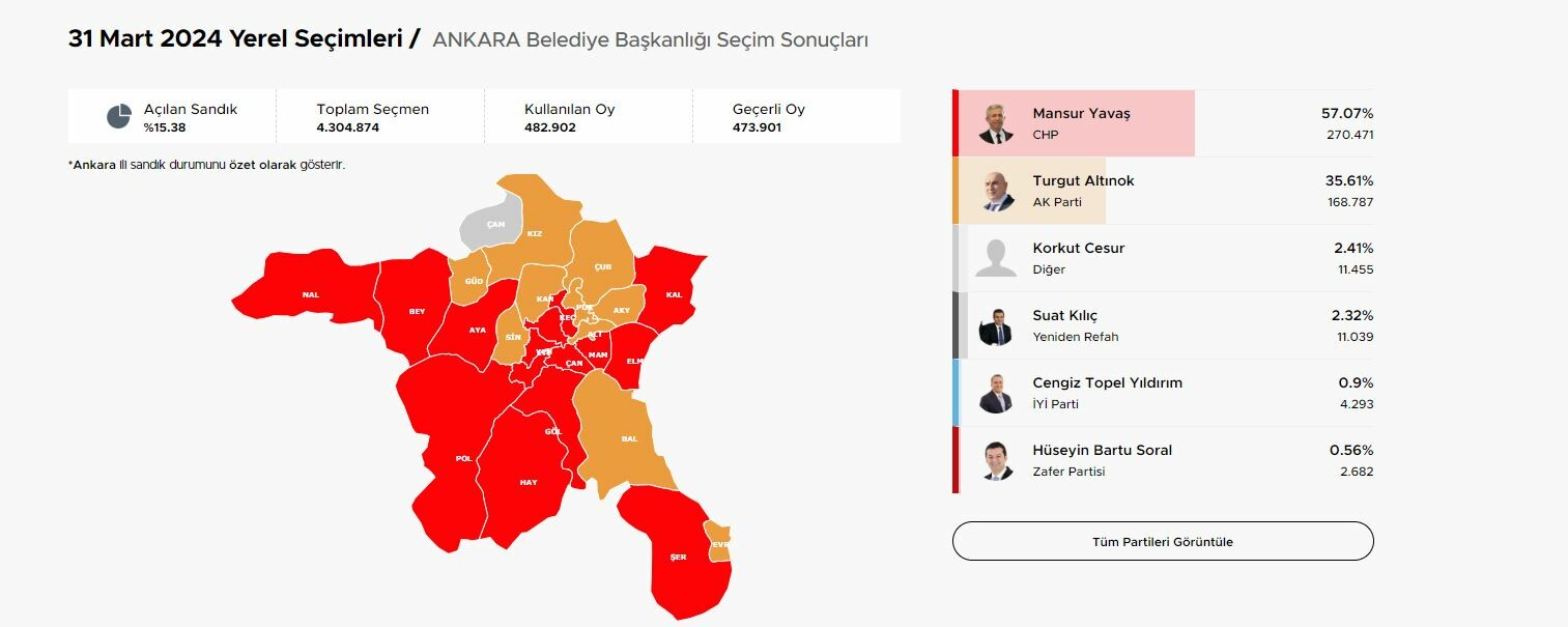 Στις 8 το βράδυ είχε λήξει η εκλογική αναμέτρηση στην Άγκυρα, καθώς ο νυν δήμαρχος Μανσούρ Γιαβάς ανακοίνωσε την επανεκλογή του στο X (Twitter):