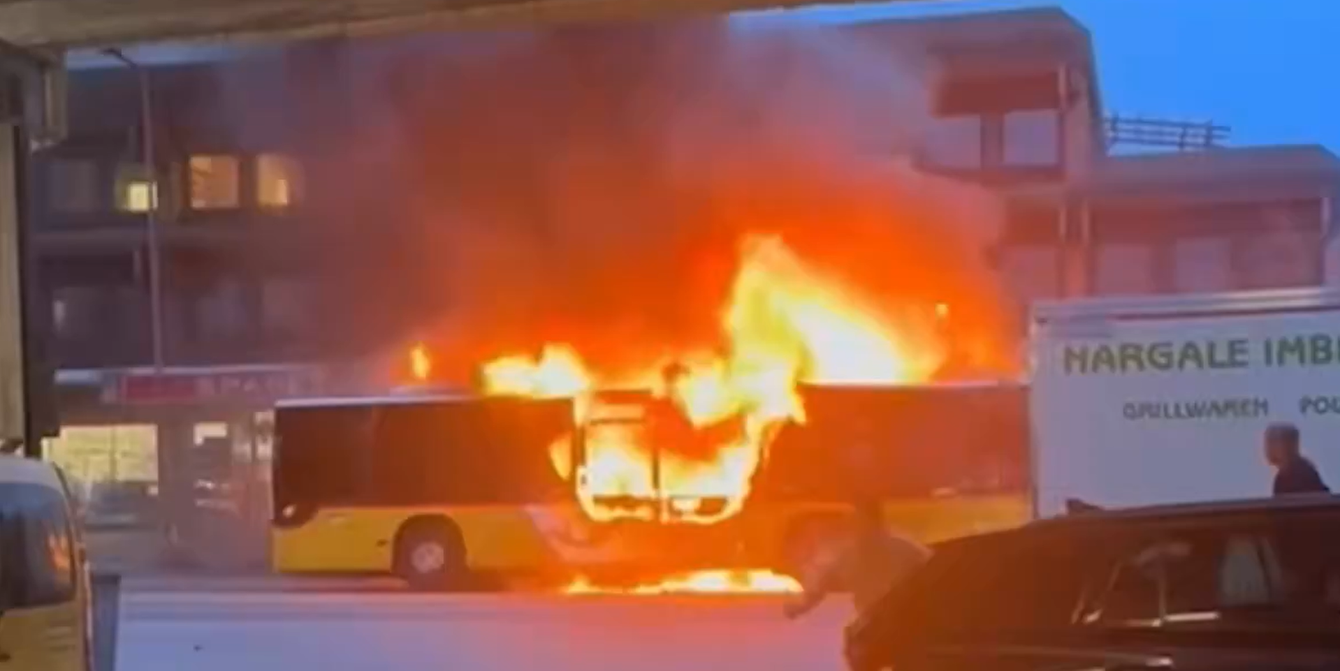 Βίντεο που κυκλοφορεί στα μέσα κοινωνικής δικτύωσης από το Kerzers δείχνει ένα λεωφορείο τυλιγμένο στις φλόγες.