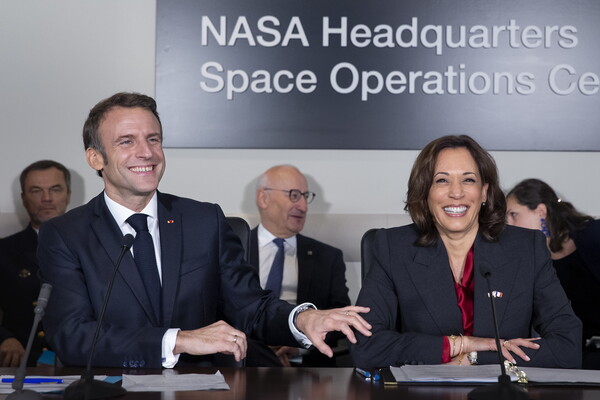 «Σας έχω έναν υποψήφιο, για την πτήση στη Σελήνη», είπε ο Γάλλος πρόεδρος στην Κάμαλα Χάρις, κατά τη διάρκεια της συνάντησής τους στην έδρα της ΝASΑ, την Τετάρτη, σε ένα στιγμιότυπο που ανάρτησε ο Μακρόν στα social media.