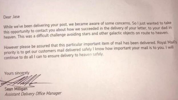 Απαντώντας στο φάκελο του Jase που ζητούσε να σταλεί στον ουρανό, ο Sean Milligan, υπάλληλος της Royal Mail δήλωσε: «Ήθελα απλώς να εκμεταλλευτώ αυτή την ευκαιρία για να επικοινωνήσω μαζί σας για το πώς πετύχαμε την παράδοση της επιστολής σας στον πατέρα σας στον ουρανό».