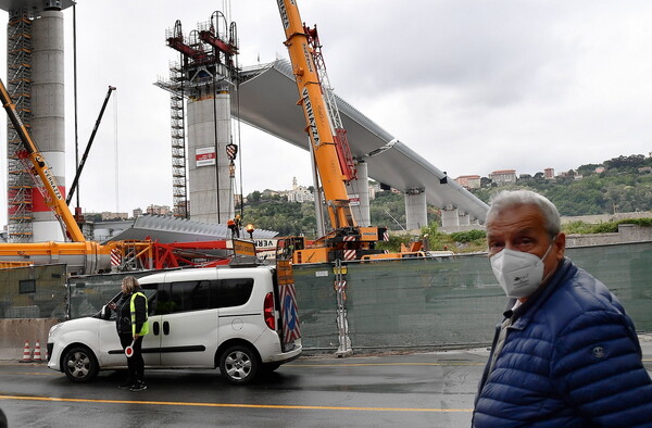 Εργάτες με μάσκες στο πρόσωπο τοποθέτησαν σήμερα το τελευταίο τμήμα της νέας οδογέφυρας στη Γένοβα.