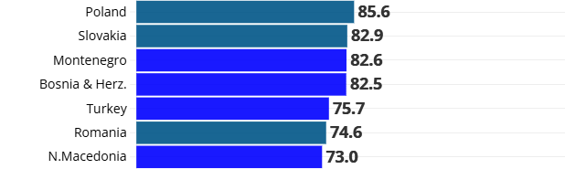 Εκτός από τη Βόρεια Μακεδονία και τη Ρουμανία, η Τουρκία (75,7 ευρώ), η Βοσνία-Ερζεγοβίνη (82,5), το Μαυροβούνιο (82,6) και η Βουλγαρία (87,1) βρίσκονται σημαντικά κάτω από τον μέσο όρο της ΕΕ.