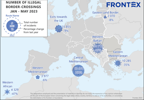 Όπως ανακοίνωσε η ευρωπαϊκή υπηρεσία Frontex, κατά τους πρώτους πέντε μήνες του 2023, οι χώρες της ΕΕ κατέγραψαν περισσότερες από 50.300 εισόδους μεταναστών μέσω της κεντρικής Μεσογείου.