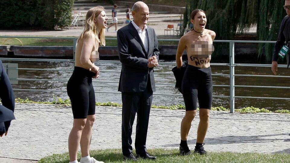 Δύο ακτιβίστριες αιφνιδίασαν τον καγκελάριο της Γερμανίας Όλαφ Σολτς, με τον οποίο ζήτησαν να φωτογραφηθούν, καθώς πέταξαν τη μπλούζα και το σουτιέν τους μένοντας γυμνόστηθες, αξιώνοντας «εμπάργκο στο ρωσικό φυσικό αέριο, τώρα», λόγω της εισβολής της Ρωσίας στην Ουκρανία.