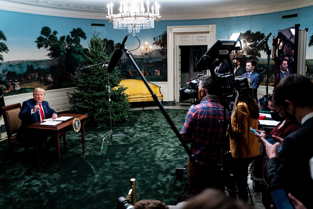 Ο απερχόμενος Αμερικανός πρόεδρος απάντησε σε ερωτήσεις δημοσιογράφων για πρώτη φορά μετά τις εκλογές. Είπε πως θα φύγει από τον Λευκό Οίκο αν το σώμα των εκλεκτόρων επικυρώσει τη νίκη του Τζο Μπάιντεν, μίλησε ξανά για εκλογική απάτη και επιτέθηκε σε δημοσιογράφους. Αλλά οι χρήστες του διαδικτύου εστίασαν στο ασυνήθιστα μικρό γραφείο στο οποίο καθόταν.