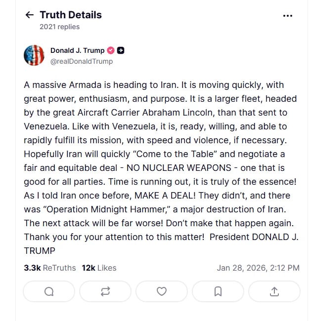 Από την πλευρά της Τεχεράνης, ο υπουργός Εξωτερικών Abbas Araghchi δήλωσε ότι οι ένοπλες δυνάμεις της χώρας είναι έτοιμες να απαντήσουν άμεσα και δυναμικά σε οποιαδήποτε επίθεση. Ο αρχηγός του ιρανικού στρατού Αμίρ Χαταμί μίλησε για «συντριπτική απάντηση», αναφέροντας ότι μονάδες του στρατού ενισχύθηκαν πρόσφατα με εκατοντάδες μη επανδρωμένα αεροσκάφη.