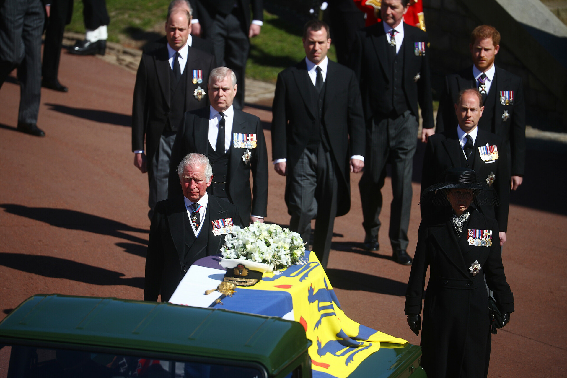 Το φέρετρο είχε τοποθετηθεί πάνω σε ένα ειδικά διαμορφωμένο Land Rover, το οποίο ακολουθούσε μια πομπή από τα ανώτερα μέλη της βρετανικής βασιλικής οικογένειας, μεταξύ των οποίων ο πρίγκιπας Κάρολος και οι πρίγκιπες Ουίλιαμ και Χάρι.