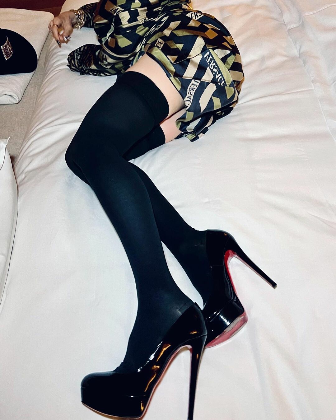 Στις φωτογραφίες, η 63χρονη τραγουδίστρια ποζάρει με κάλτσες πάνω από το γόνατο, μια ρόμπα Versace και ψηλοτάκουνες γόβες Christian Louboutin, έχοντας τα μαλλιά της πιασμένα σε κοτσίδες.