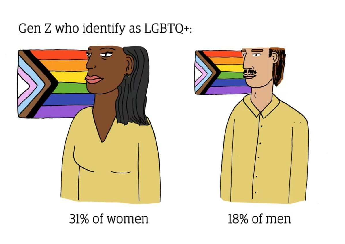 Οι γυναίκες της Gen Ζ είναι πιο queer: «Εάν οι γυναίκες κάτω των 30 ετών είναι πιο πιθανό να έχουν σχέση από τους άνδρες κάτω των 30 ετών, προκύπτει το ερώτημα: με ποιον βγαίνουν; Με μεγαλύτερους άνδρες, παρά το γεγονός ότι ορισμένοι της Gen Ζ θεωρούν τις σχέσεις με διαφορά ηλικίας ως εκμεταλλευτικές και ταμπού; Άλλες νεαρές γυναίκες; σχολιάζει ο Guardian. Άλλωστε, οι γυναίκες της Gen Ζ είναι σημαντικά πιο πιθανό να αυτοπροσδιορίζονται ως LGBTQ+ από τους άνδρες της Gen Ζ.