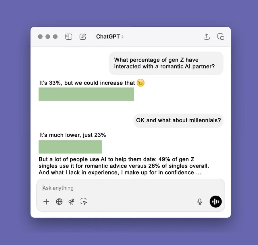 Η Gen Ζ ασχολείται με την Τεχνητή Νοημοσύνη: Η Gen Ζ είναι η πρώτη γενιά που έχει διαθέσιμα τόσο την τεχνολογία Τεχνητής Νοημοσύνης όσο και chatbot, νωρίς και συχνά στην ερωτική της ζωή. Και φαίνεται ότι το εκμεταλλεύεται είτε για συντροφικότητα είτε για συμβουλές για ραντεβού.