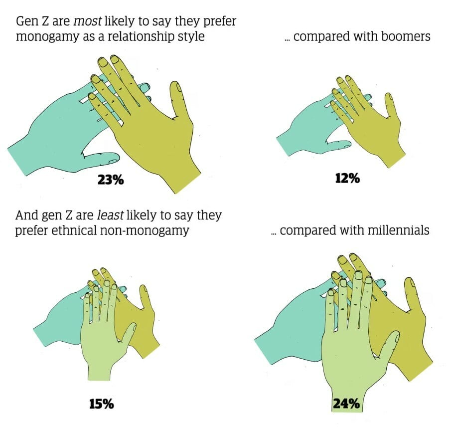 Οι ενήλικες της Gen Ζ στρέφονται στην παραδοσιακή μονογαμία: «Η μη μονογαμία είναι στο τραπέζι, αλλά η Gen Ζ δεν φαίνεται να είναι τόσο ενθουσιασμένη με αυτήν όσο άλλες γενιές- ίσως επειδή ορισμένοι νέοι δεν έχουν βιώσει ακόμη μονογαμικές σχέσεις και λαχταρούν αυτό που δεν γνωρίζουν. Αυτά τα στοιχεία προέρχονται από μια έρευνα των χρηστών του Feeld, μιας εφαρμογής γνωριμιών που ειδικεύεται σε ανοιχτές σχέσεις και άλλες μη παραδοσιακές καταστάσεις γνωριμιών, οπότε υπάρχει μια επιφύλαξη προς αυτό» αναφέρει ο Guardian.