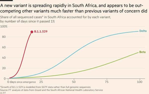 «Το νέο στέλεχος εξαπλώνεται γρήγορα στη Νότια Αφρική και φαίνεται ότι υπερτερεί των άλλων στελεχών πολύ πιο γρήγορα σε σύγκριση με το τι έκαναν τα προηγούμενα στελέχη ενδιαφέροντος», αναφέρουν οι Financial Times και παραθέτουν γράφημα με δεδομένα από τη Νότια Αφρική, που συγκρίνει το Β.1.1.529 και τις μεταλλάξεις Δέλτα και Βήτα.