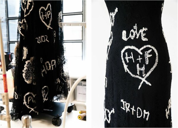 Πάνω στο μαύρο φόρεμα που έραψε η ομάδα της Σάρα Μπάρτον διακρίνονταν η λέξη Love (αγάπη), αλλά και καρδιές.