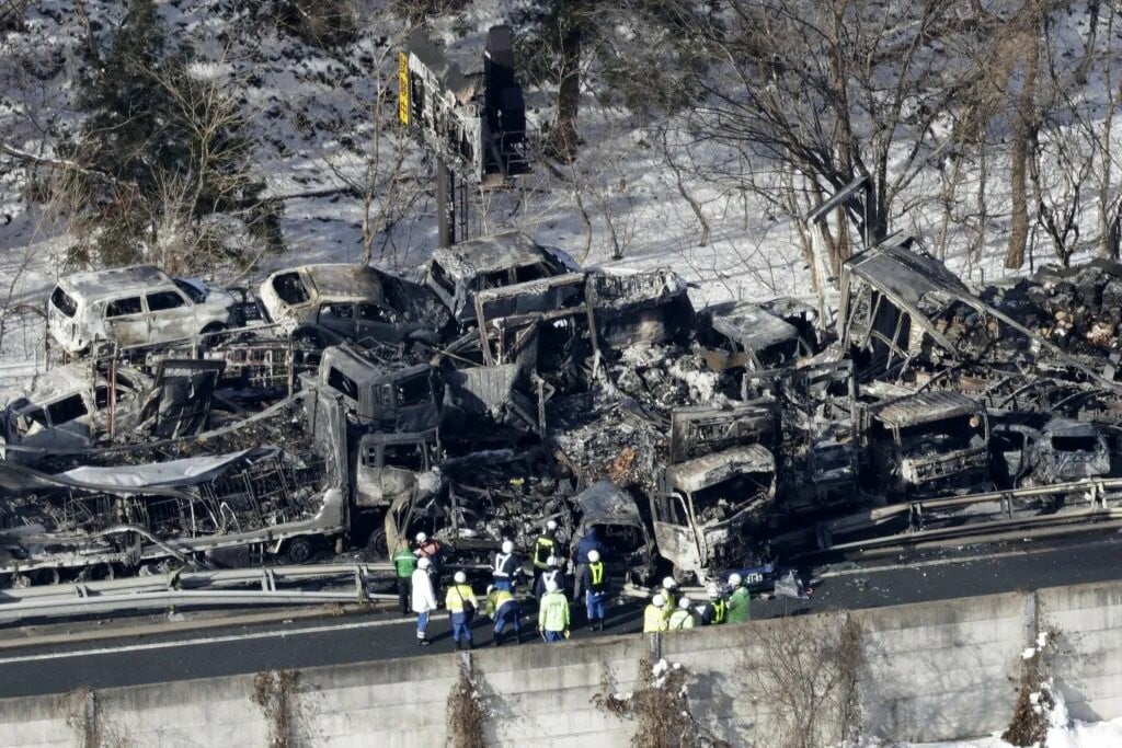 Police say icy road conditions and a collision between two trucks triggered the chain reaction and multiple fires. #Japan #Gunma pic.twitter.com/bA1KPNMJSp
