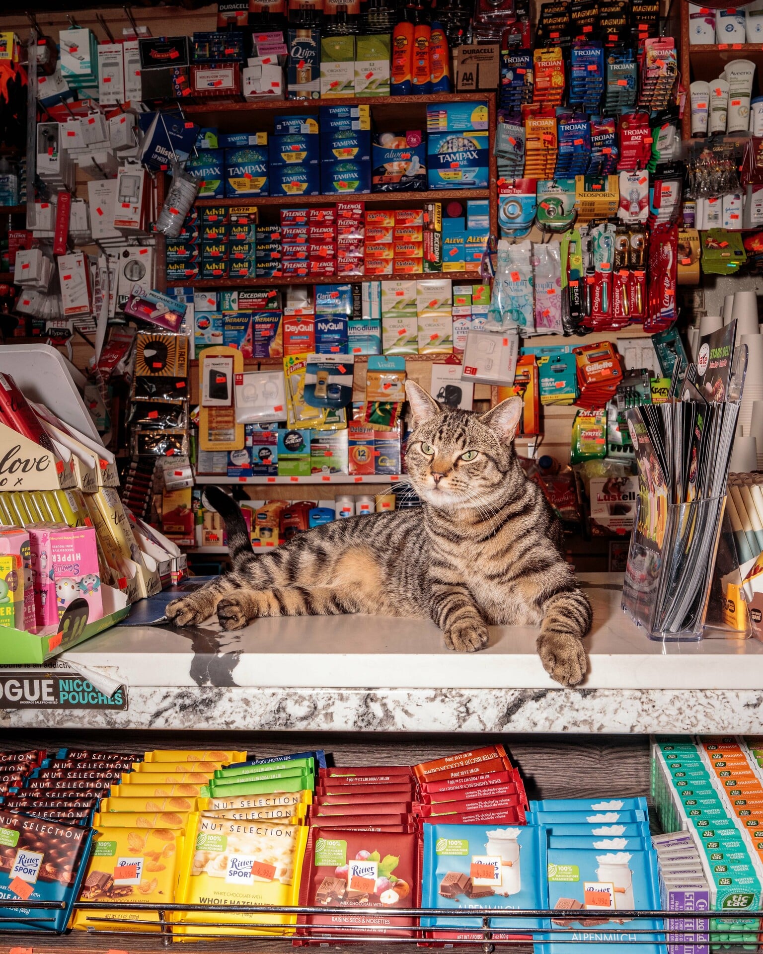 Περίπου το ένα τρίτο των 10.000 περίπου μίνι μάρκετ της πόλης πιστεύεται ότι έχουν μια γάτα, παρά το γεγονός ότι υπόκεινται σε πρόστιμα 200-350 δολαρίων για τη διατήρηση ζώων σε κατάστημα που πωλεί τρόφιμα, σύμφωνα με τον Νταν Ριμάδα, ιδρυτή του «Bodega Cats of New York».