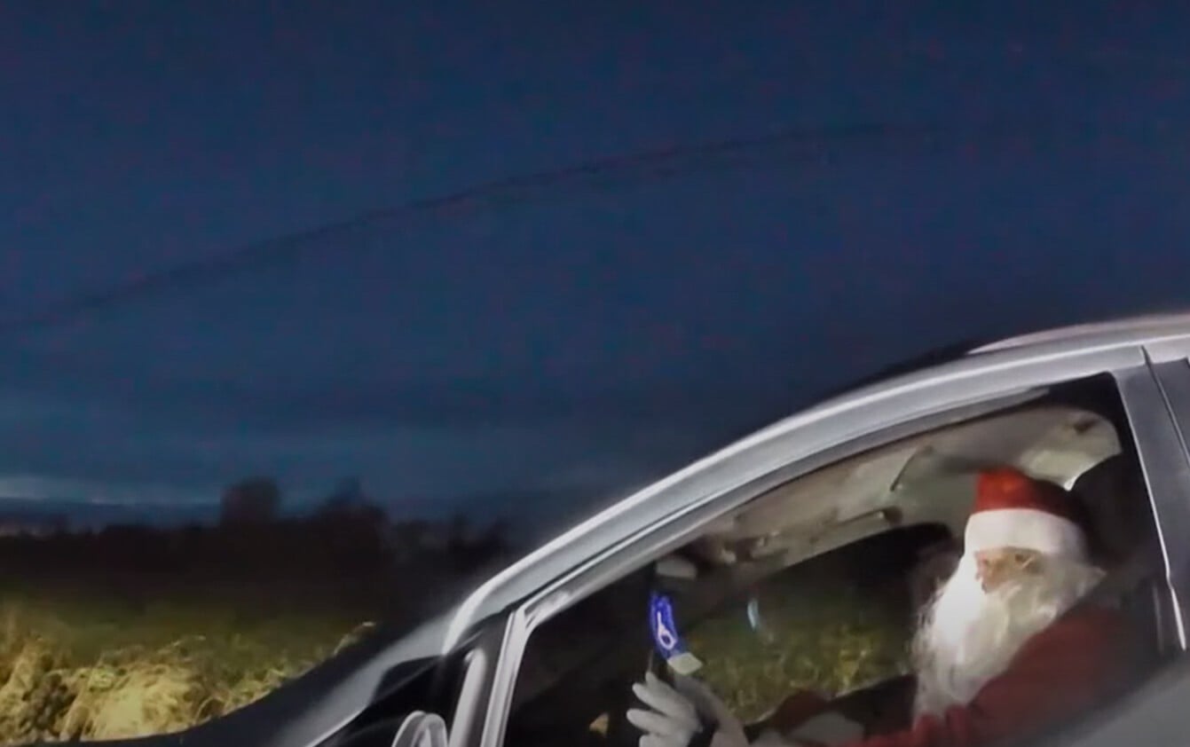 Στο βίντεο διακρίνεται ένα περιπολικό να σταματά το όχημά του και όταν πλησίασαν οι αστυνομικοί αντιλήφθηκαν ότι οδηγός ήταν ένας Άγιος Βασίλης και δίπλα του η κυρία Κλάους, αντιμετωπίζοντας το περιστατικό με χιούμορ.