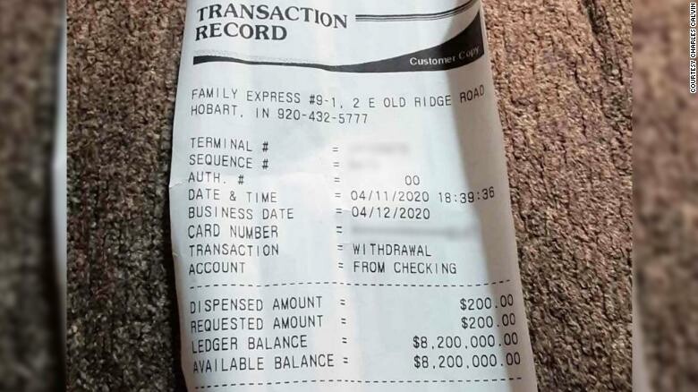 Όταν ο 45χρονος έφτασε στο ΑΤΜ έκανε ανάληψη 200 δολαρίων αλλά, λαμβάνοντας την απόδειξη, παρατήρησε ότι το υπόλοιπο του λογαριασμού του είχε έναν αριθμό με «πολλά μηδενικά πίσω του». Διαθέσιμο υπόλοιπο: 8.200.000,00 δολ. «Τι συμβαίνει στον κόσμο, φίλε; Αυτό δεν φαίνεται σωστό», είπε ο Κάλβιν, μιλώντας στο CNN.