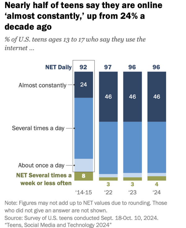 Σε μια εποχή έντονων ανησυχιών για τις επιπτώσεις της τεχνολογίας στους νέους, οι έφηβοι στις Ηνωμένες Πολιτείες εξακολουθούν να είναι περισσότερο συνδεδεμένοι στο διαδίκτυο από ποτέ. Σύμφωνα με νέα έρευνα του Pew Research Center, σχεδόν το 96% των εφήβων ηλικίας 13-17 ετών χρησιμοποιούν καθημερινά το διαδίκτυο, με το σχεδόν 50% να δηλώνουν ότι είναι «σχεδόν συνεχώς» online.