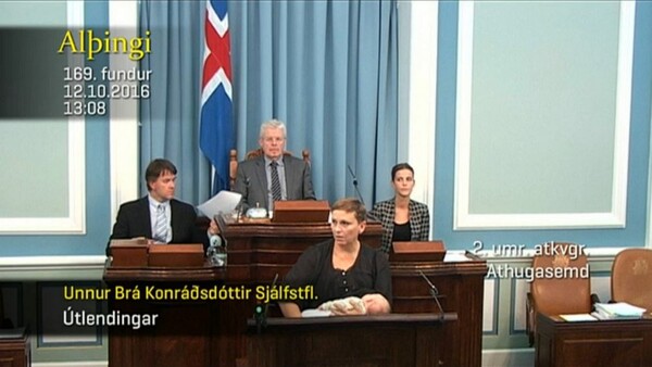 Η Ουνούρ Μπρα Κονραντσντότιρ, που προέρχεται από το συντηρητικό Κόμμα της Ανεξαρτησίας, μίλησε στους συναδέλφους της στην Αλθίνγκι (κοινοβούλιο) ενώ θήλαζε την κόρη της, ηλικίας 6 μηνών. Η ίδια χαρακτήρισε την πράξη της "το φυσιολογικότερο πράγμα του κόσμου".