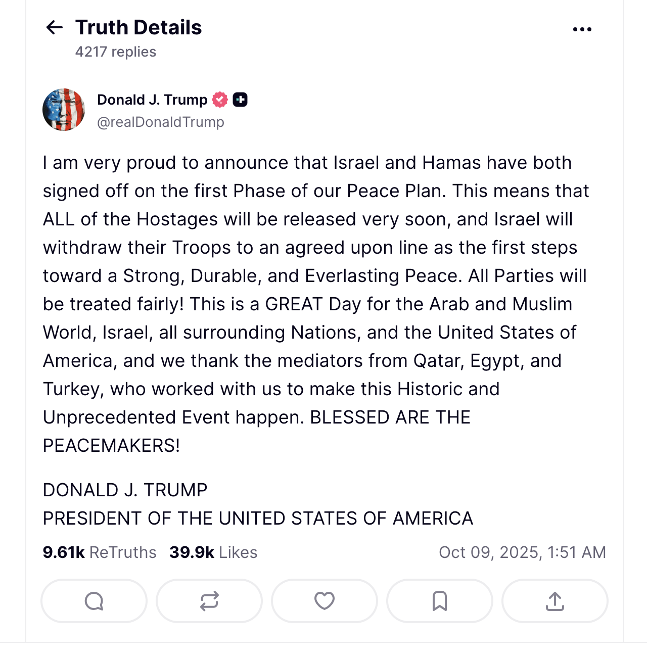 «Είμαι πολύ περήφανος που ανακοινώνω ότι το Ισραήλ και η Χαμάς έχουν εγκρίνει την πρώτη φάση του ειρηνευτικού μας σχεδίου. Αυτό σημαίνει ότι ΟΛΟΙ οι όμηροι θα απελευθερωθούν πολύ σύντομα και το Ισραήλ θα αποσύρει τα στρατεύματά του σε μια συμφωνημένη γραμμή, ως πρώτα βήματα προς μια ισχυρή, σταθερή και διαρκή ειρήνη», σε ανάρτηση πουν έκανε στο Truth. «Όλα τα μέρη θα τύχουν δίκαιης μεταχείρισης!».