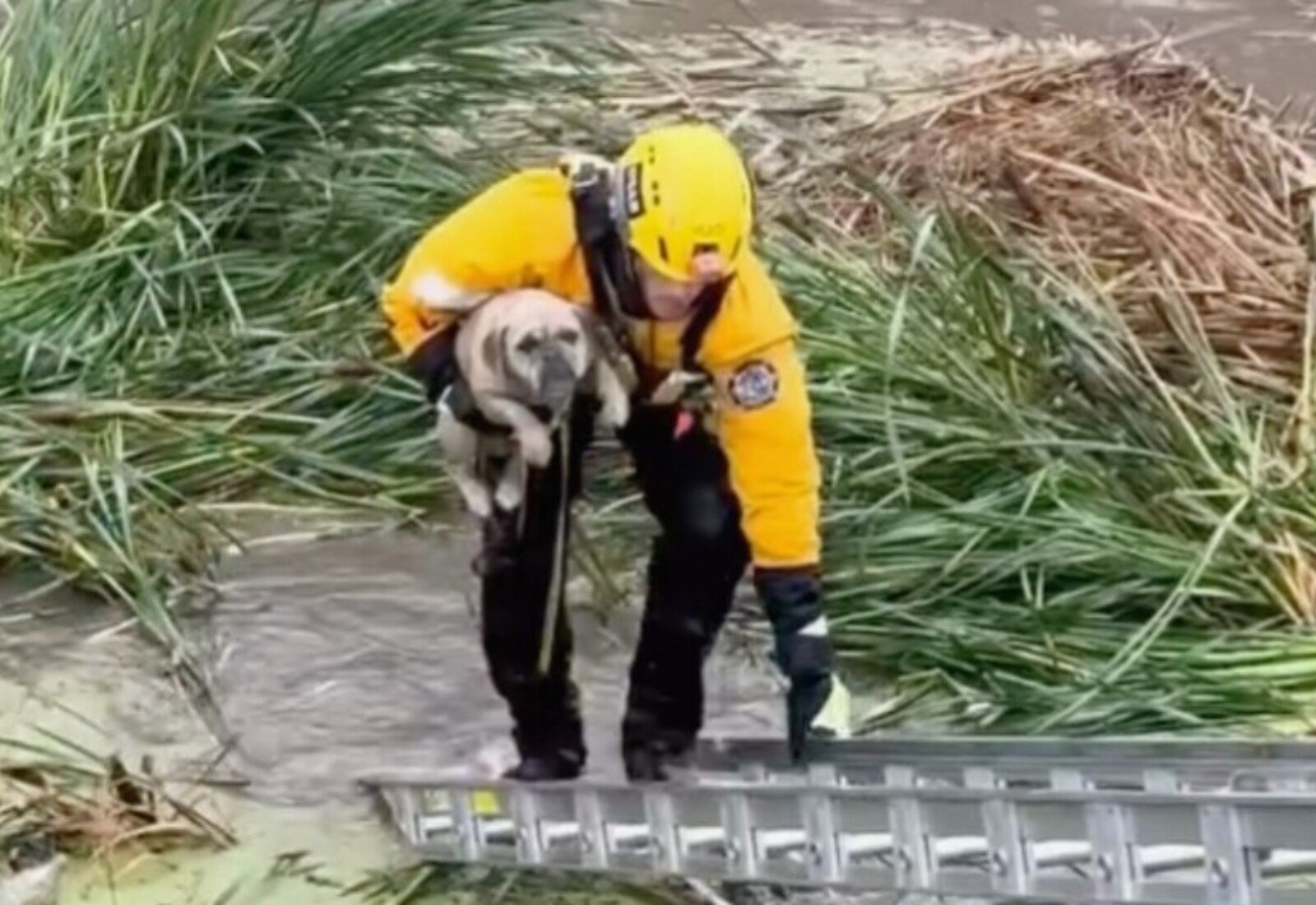 Το βίντεο δείχνει τον πυροσβέστη της κομητείας Βεντούρα να κατεβαίνει μια σκάλα για να φτάσει στο σκυλί, το οποίο είχε κολλήσει σε καλάμια στην άκρη ενός καναλιού, βορειοδυτικά του Λος Άντζελες.