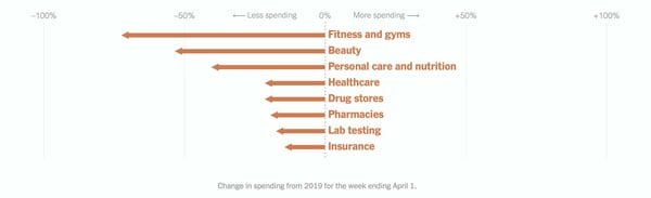 Οι New York Times παρουσίασαν μία ανάλυση δεδομένων της εταιρείας Earnest Research, που παρακολουθεί τις αγορές μέσω χρεωστικών και πιστωτικών καρτών περίπου έξι εκατομμυρίων Αμερικανών. Αν και τα δεδομένα δεν περιλαμβάνουν τις συναλλαγές με μετρητά, προσφέρουν ένα ενδεικτικό αποτύπωμα των συνεπειών του κορωνοϊού στην αγορά.
