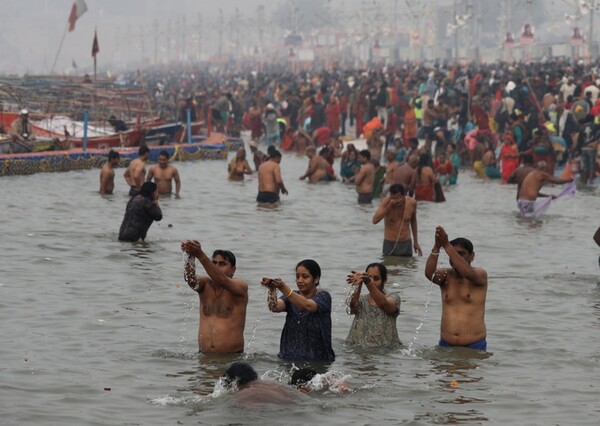 Πριν καν βγει ο ήλιος, οι πρώτες ομάδες προσκυνητών μπήκαν στα παγωμένα νερά, στο σημείο όπου ενώνονται οι ιεροί ποταμοί Γάγγης, Γιαμούνα και ο μυθικός Σαρασβάτι, για να ξεπλύνουν τις αμαρτίες τους, όπως απαιτεί η ινδουιστική παράδοση. «Η χαρά είναι μεγάλη», λέει η 45χρονη Σουρμίλα Ντέβι βγαίνοντας από το νερό. «Για μένα, είναι σαν να βυθίζομαι μέσα σε νέκταρ». «Παρά το πλήθος, αισθάνομαι μια απέραντη γαλήνη», λέει ο Γκοπάλ Ντέβι Σάντι Γκουτζάρ, ο οποίος έκανε το ταξίδι μέχρι εκεί από το δυτικό ινδικό κρατίδιο Ρατζαστάν.