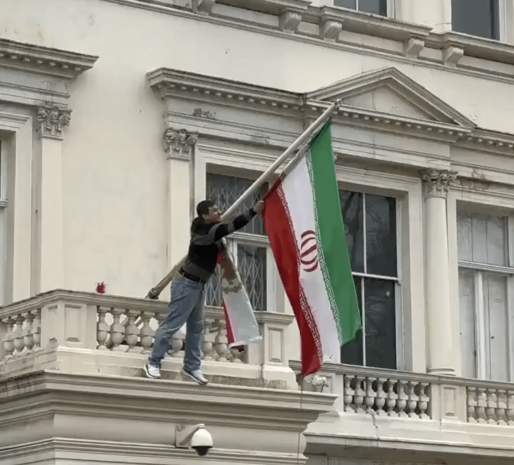 Σκηνές έντασης εκτυλίχθηκαν έξω από την ιρανική πρεσβεία στο Λονδίνο, όταν ένας άνδρας σκαρφάλωσε στην πρόσοψη του κτιρίου, βγήκε σε μπαλκόνι και κατέβασε τη σημαία της Ισλαμικής Δημοκρατίας. Στη θέση της ύψωσε τη σημαία «Λιοντάρι και Ήλιος», το σύμβολο της προεπαναστατικής περιόδου, που έχει απαγορευτεί στο Ιράν μετά το 1979.