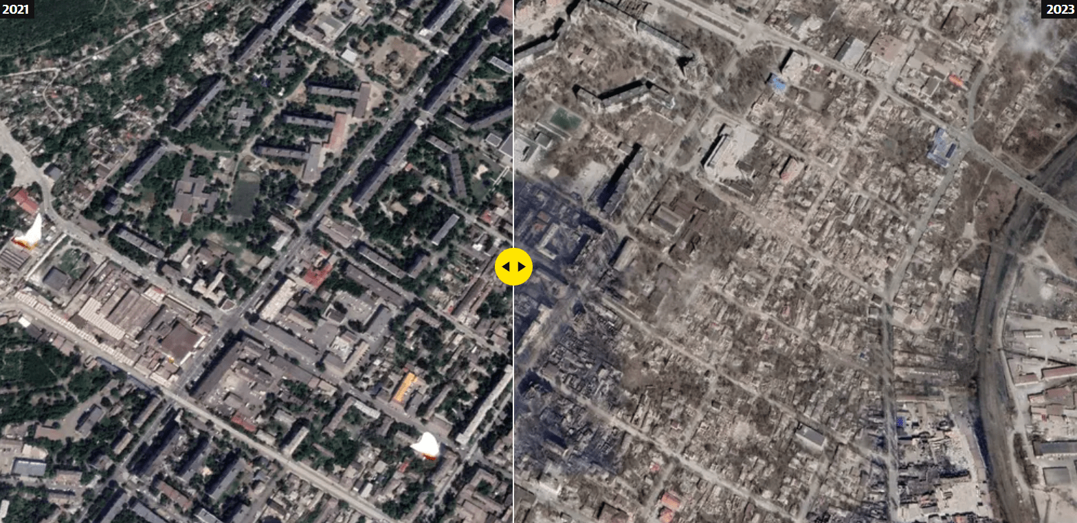 Ενημερωμένες δορυφορικές εικόνες που φέρνει στο φως ο Guardian δείχνουν το πριν και το μετά σε μεγάλα τμήματα της Μαριούπολης.