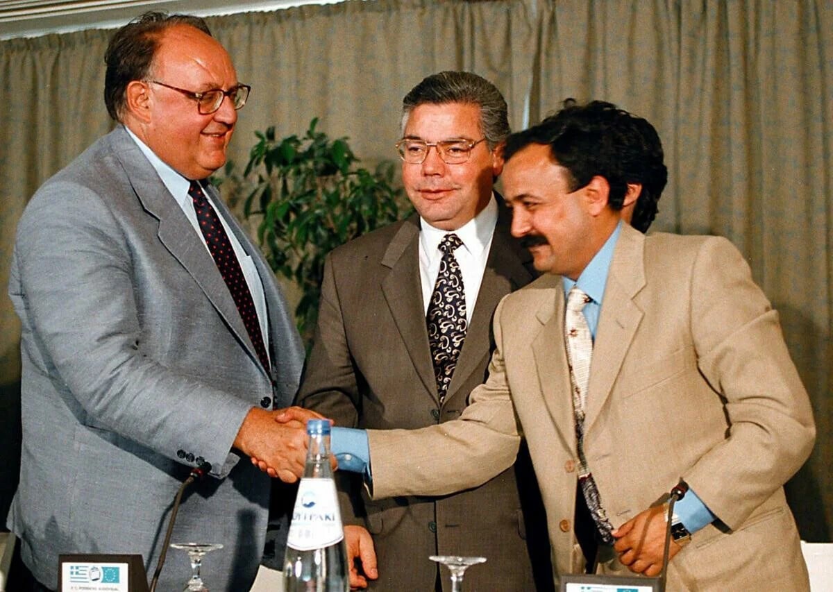 Ο Έλληνας Υπουργός Εξωτερικών Θεόδωρος Πάγκαλος (αριστερά) σφίγγει το χέρι του Ισραηλινού εκπροσώπου Μαξίμ Λέβι (κέντρο) και του Παλαιστίνιου εκπροσώπου Μαρουάν Μπαργκούτι (δεξιά) / Φωτ: EPA, αρχείου