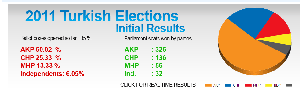 Μεγάλη νίκη αναμένεται να σημειώσει το κυβερνών Κόμμα Δικαιοσύνης και Ανάπτυξης (ΑΚΡ) του πρωθυπουργού Ρετσέπ Ταίπ Ερντοάν στις σημερινές γενικές εκλογές στην Τουρκία. Μέχρι στιγμής λαμβάνει το 50,92% των ψήφων και 326 έδρες στο τουρκικό κοινοβούλιο ενώ το αντίπαλο Ρεπουμπλικανικό Λαϊκό Κόμμα των κεμαλιστών το 25,33% και 136 έδρες. Το Κόμμα Εθνικής Δράσης βρίσκεται στο 13,33% των ψήφων, υπερβαίνοντας το 10% που είναι το όριο για την είσοδο στην τουρκική βουλή. Στις εκλογές του 2007 το κόμμα του κ. Ερντογάν είχε κερδίσει τις εκλογές με ποσοστό 46,5 %. Οι Ρεπουμπλικανοί φαίνετια να εξασφαλίζουν την πλειοψηφία στις επαρχίες της Σμύρνης, του Τουντσελί, του Αιδινίου, την Ανδριανούπολη.