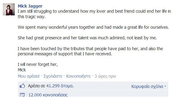 Δραματικό μήνυμα για την αυτοκτονία της συντρόφου του Λ' Ορεν Σκοτ, η οποία βρέθηκε τη Δευτέρα κρεμασμένη στο διαμέρισμά της στη Νέα Υόρκη έγραψε στην σελίδα του στο Facebook ο Μίκ Τζάγκερ.