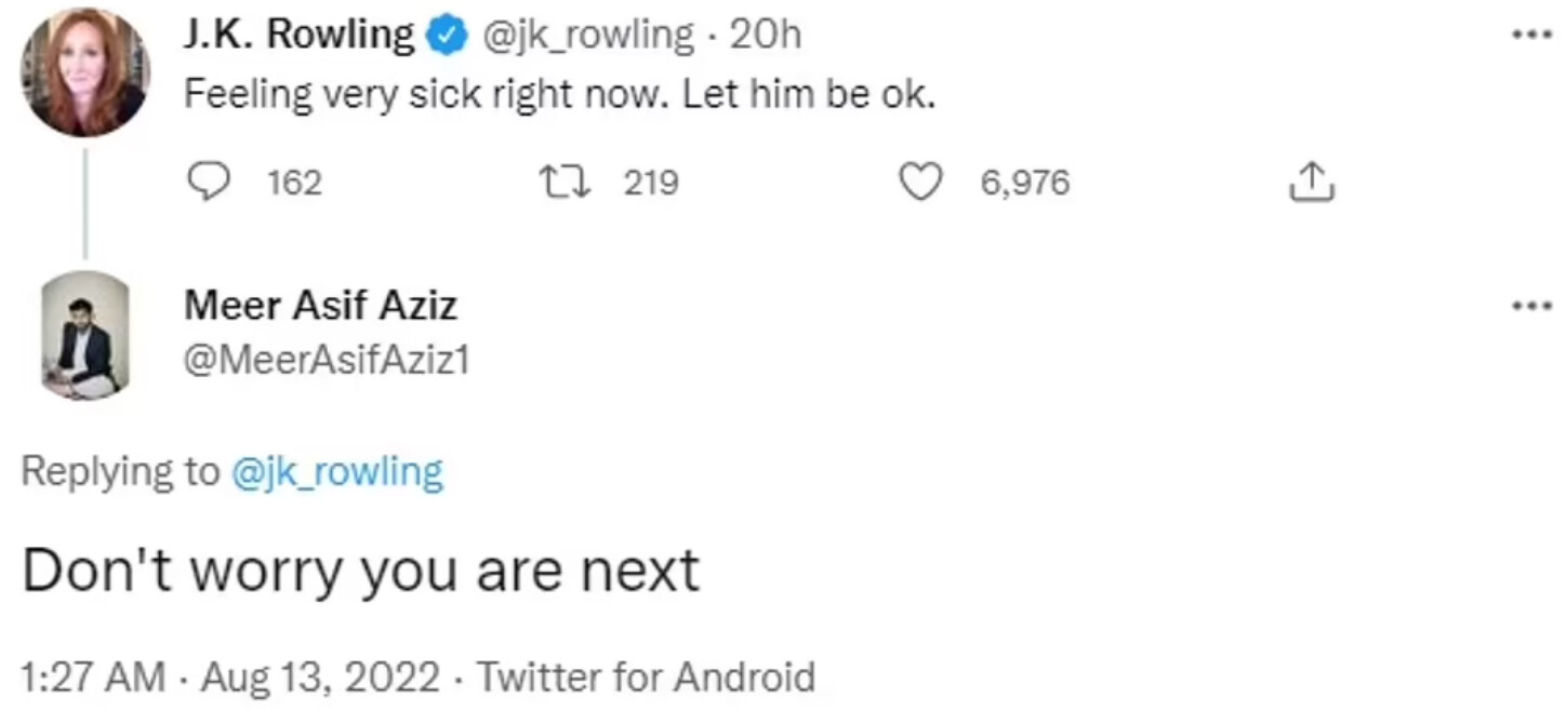 Ανάμεσα στα σχόλια, υπήρχε και αυτό του Meer Asif Aziz, ο οποίος εκτόξευσε απειλές κατά της JK Rowling.