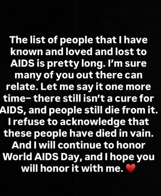 Πιο αναλυτικά, γράφει στο προφίλ της: «Σήμερα είναι η Παγκόσμια Ημέρα AIDS. Για τέσσερις δεκαετίες, αυτή η ημέρα αναγνωρίζεται διεθνώς από ανθρώπους σε όλο τον κόσμο, επειδή εκατομμύρια ζωές έχουν σημαδευτεί από την κρίση του HIV.