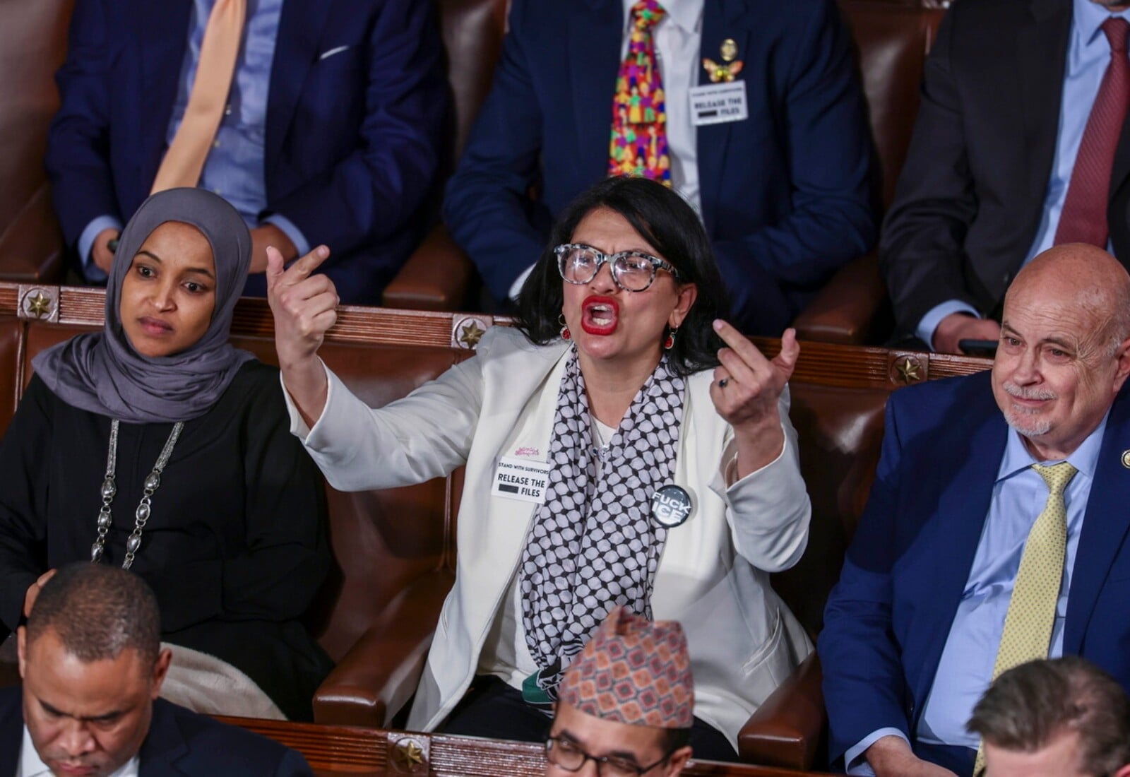 Τόσο η Ομάρ όσο και η Τλάιμπ φώναξαν «σκοτώνετε Αμερικανούς» απευθυνόμενες στον πρόεδρο Τραμπ κατά τη διάρκεια της ομιλίας, με την κ. Όμαρ να τον κατηγορεί επίσης πως είναι «ψεύτης».