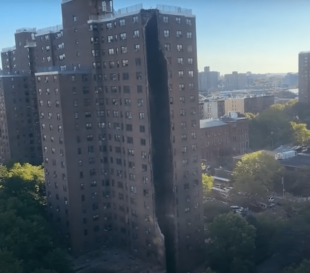 Σύμφωνα με τις αρχές, κατέρρευσε ο άξονας απορριμμάτων του κτιρίου, προκαλώντας σοβαρές ζημιές στη γωνία της πολυκατοικίας. Φωτογραφίες που έδωσε στη δημοσιότητα η Πυροσβεστική δείχνουν ένα απανθρακωμένο άνοιγμα να διατρέχει κάθετα την πρόσοψη. Το κτίριο, το οποίο χτίστηκε το 1966, στεγάζει περίπου 3.462 κατοίκους και διαχειρίζεται από τη Δημοτική Αρχή Στέγασης (NYCHA).