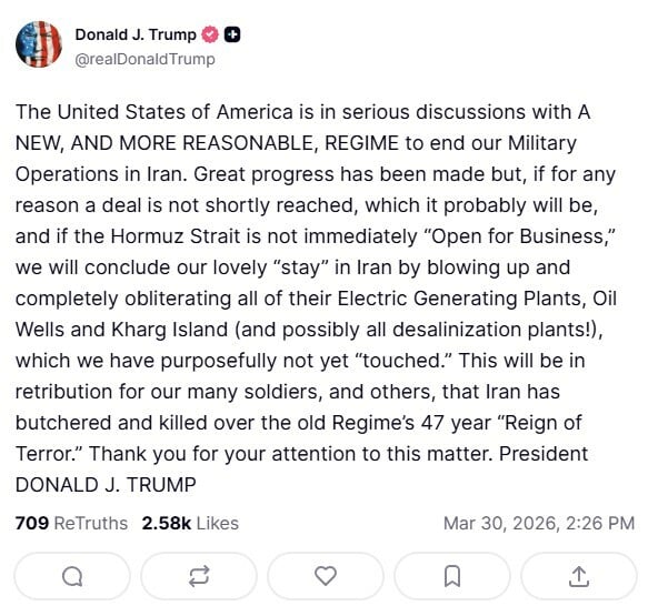 «Οι Ηνωμένες Πολιτείες βρίσκονται σε σοβαρές διαπραγματεύσεις με ένα νέο και πιο λογικό καθεστώς για τον τερματισμό των στρατιωτικών μας επιχειρήσεων στο Ιράν. Έχει σημειωθεί μεγάλη πρόοδος, ωστόσο, αν για οποιονδήποτε λόγο δεν επιτευχθεί σύντομα συμφωνία, κάτι που πιθανότατα θα συμβεί, και τα Στενά του Ορμούζ δεν ανοίξουν άμεσα για το εμπόριο, θα τερματίσουμε την “παρουσία” μας στο Ιράν καταστρέφοντας και ισοπεδώνοντας πλήρως όλες τις μονάδες παραγωγής ενέργειας, τα πετρελαιοπηγές και το νησί Χαργκ (και πιθανώς όλες τις μονάδες αφαλάτωσης!) που δεν έχουμε πλήξει μέχρι τώρα. Αυτό θα αποτελέσει αντίποινα για τους πολλούς στρατιώτες μας και άλλους που σκοτώθηκαν κατά τη διάρκεια της 47χρονης “περιόδου τρομοκρατίας” του προηγούμενου καθεστώτος του Ιράν. Σας ευχαριστώ για την προσοχή σας».