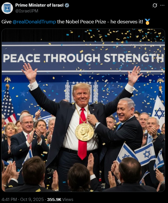 «Δώστε το Νόμπελ Ειρήνης στον Τραμπ», έγραψε ο Μπενιαμίν Νετανιάχου σε νέα ανάρτησή του στο X (πρώην Twitter), συνοδεύοντάς τη με μια εικόνα που δημιουργήθηκε μέσω Τεχνητής Νοημοσύνης.