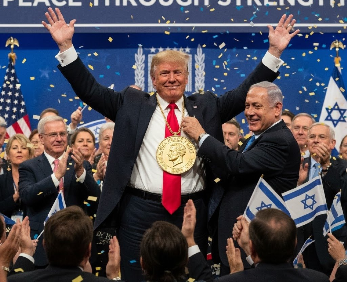 Στην AI φωτογραφία, ο Ντόναλντ Τραμπ και ο Νετανιάχου απεικονίζονται να πανηγυρίζουν μαζί τη βράβευσή του Αμερικανού προέδρου, ο οποίος φορά χρυσό μετάλλιο στο στήθος και δέχεται χειροκροτήματα από πλήθος.