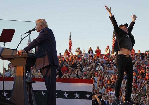 Όμως κάποιες φωνές στη Ουάσιγκτον υπογραμμίζουν την πρόσφατη συμπόρευση του Μασκ με τον Ντόναλντ Τραμπ, για χάρη του οποίου ο πλουσιότερος άνθρωπος στον κόσμο δεν έχει διστάσει να μοιραστεί θεωρίες συνωμοσίες στο X (πρώην Twitter), το μέσο το οποίο του ανήκει. Μάλιστα, ο Μασκ πλέον εμφανίζεται μαζί με τον Ντόναλντ Τραμπ στην προεκλογική του καμπάνια, δηλώνοντας ότι ανήκει στο δόγμα MAGA (Make America Great Again) και χοροπηδώντας με ενθουσιασμό για τον 45ο πρόεδρο.