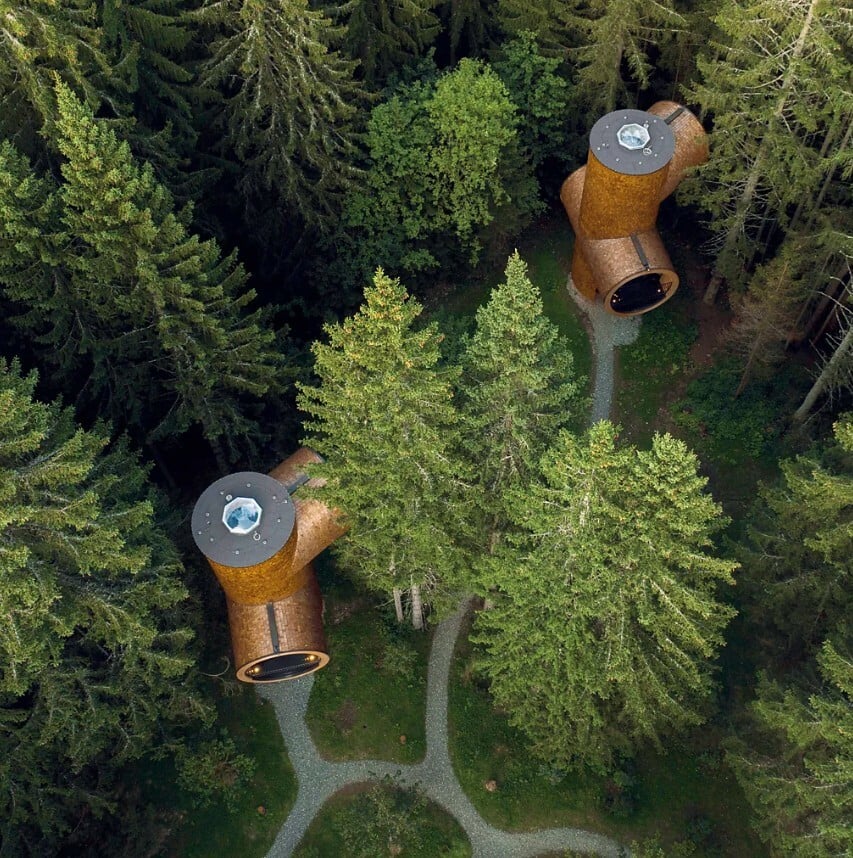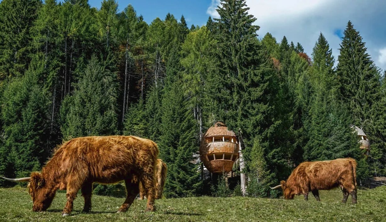 Σε υψόμετρο 1.200 μέτρων, και με εκπληκτική θέα στις ιταλικές Άλπεις, βρίσκονται δύο δεντρόσπιτα σε σχήμα που θυμίζει υπερμεγέθη κουκουνάρια. Το καθένα είναι σκαλισμένο από ξύλο ελάτης με κέλυφος επενδυμένο με αγριόπευκο, μιμούμενο τη φύση για να ενσωματωθεί με το περιβάλλον του. «Η αναρρίχηση σε αυτά τα ξύλινα σπίτια είναι σαν να μπαίνεις σε ένα παραμύθι, είναι σαν να σε αγκαλιάζουν»