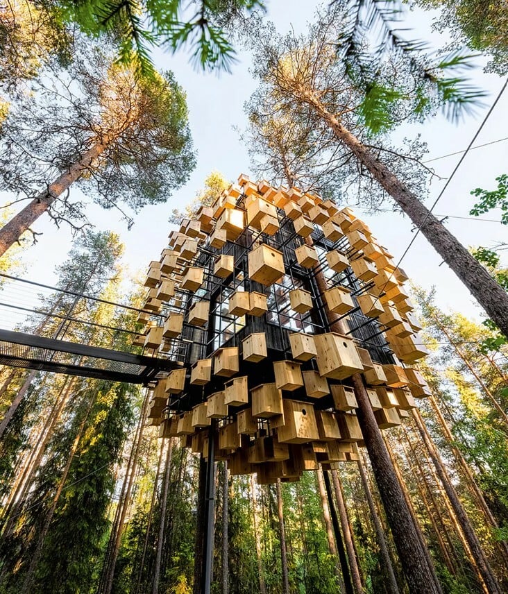 Για ορισμένους αρχιτέκτονες δεντρόσπιτων, η εγγύτητα με τη φύση σημαίνει ότι την προσκαλούν ενεργά μέσα τους. Φαίνεται να αιωρείται στο θόλο του δάσους, η Biosphere είναι γεμάτη με 350 σπίτια πουλιών, προσελκύοντας όχι μόνο πουλιά, αλλά και νυχτερίδες και μέλισσες. Η κατασκευή αποτελεί μέρος του Treehotel, ενός συνόλου οκτώ διαφορετικών σχεδίων. Δημιουργήθηκε σε συνεννόηση με έναν ορνιθολόγο ως απάντηση στην απώλεια των πτηνών. Οι ανθρώπινες ανέσεις είναι επίσης, καλά καλυμμένες, παρέχοντας υπηρεσίες και συνθήκες όπως σάουνα και ταράτσα κατάλληλη για περπάτημα.