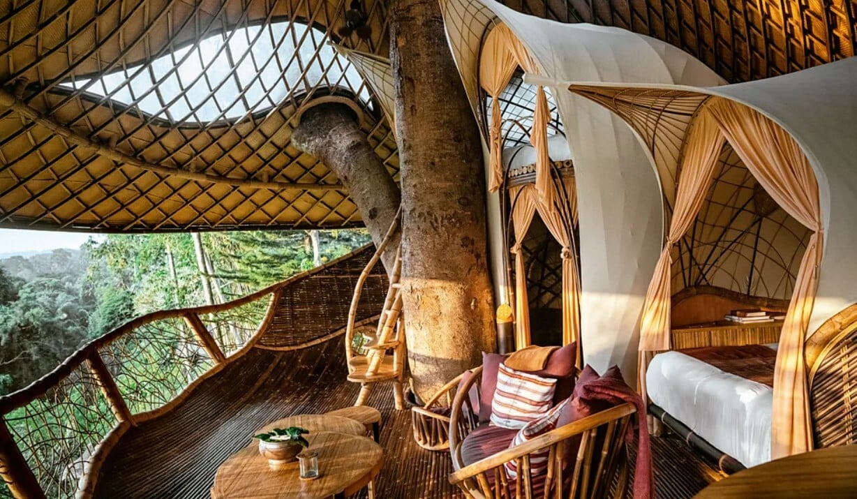 Στο τροπικό δάσος της περιοχής Ubud του Μπαλί, βρίσκεται ένα δεντρόσπιτο. Η υπαίθρια κατασκευή, συμπεριλαμβανομένων των τοίχων και των δαπέδων της, είναι σχεδόν εξ ολοκλήρου από μπαμπού, το ταχύτερα αναπτυσσόμενο φυτό στον πλανήτη. Η κατασκευή που μοιάζει με καλάθι, ενσωματώνεται σχεδόν άψογα στη ζούγκλα. Οι αιχμηρές γωνίες της σύγχρονης αρχιτεκτονικής έχουν εξαφανιστεί και αντικατασταθεί από τις απαλές καμπύλες της φύσης. «Τα δάπεδα κυρτώνουν προς τα πάνω σε σαρωτικούς τοίχους, ενώ η οροφή αιωρείται πάνω από τον θόλο», με τον χώρο να μοιάζει με φωλιά χωρίς καθορισμένες άκρες.