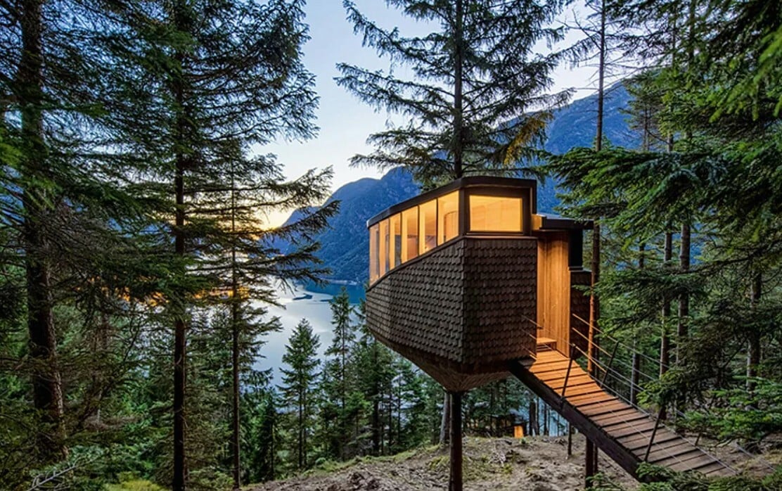 Για ορισμένους σχεδιαστές και ονειροπόλους, το δεντρόσπιτο έχει να κάνει με τον ρομαντισμό. Ο Kjartan Arno ήθελε να κάνει πρόταση γάμου στην κοπέλα του, Sally, και αποφάσισε να χτίσει ένα δεντρόσπιτο για να το κάνει. Η απλή κατασκευή ύψους 10 μέτρων, στην οποία η πρόσβαση γινόταν μέσω μιας ανάβασης μέσα από τα κλαδιά της, έγινε ένα μέρος ευτυχισμένων αναμνήσεων, οδηγώντας το ζευγάρι να συνεργαστεί με τους αρχιτέκτονες Helen & Hard για να δημιουργήσουν ένα πιο φιλόδοξο καταφύγιο: το Woodnest. Αγκαλιάζοντας τον στενό κορμό ενός πεύκου, έτσι ώστε να φαίνεται ότι στέκεται στο ένα πόδι- και προσβάσιμο αυτή τη φορά από μια γέφυρα- το Woodnest μπορεί να φιλοξενήσει τέσσερα άτομα και διαθέτει μπάνιο με εκπληκτική θέα.