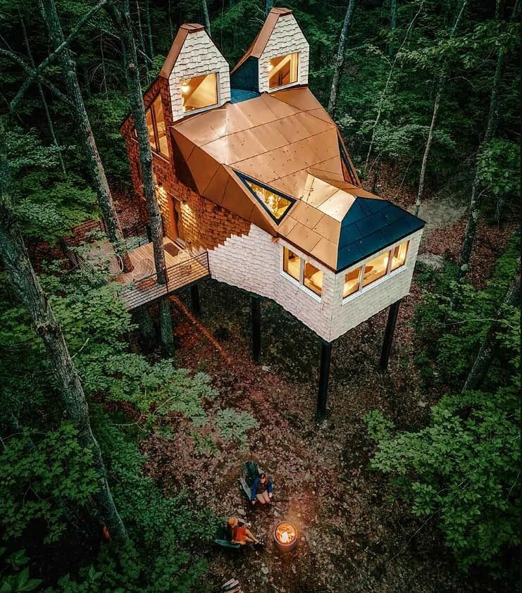 «Από τότε που θυμάμαι τον εαυτό μου, πάντα ήθελα να φτιάξω το δικό μου δεντρόσπιτο», λέει η Heidi Richards στο BBC. «Είχαμε ένα μεγάλο δέντρο στην αυλή μας- στο οποίο ήμουν συνεχώς- προσπαθώντας πάντα να σκαρφαλώνω όλο και πιο ψηλά». Η «Copper Fox», που σχεδιάστηκε και κατασκευάστηκε με τον σύζυγό της, Nicholas, χρησιμοποιώντας κυρίως κορμούς και υπολείμματα, είχε σκοπό να μοιάζει «με γλυπτό σε μεγάλη κλίμακα». Το ρύγχος της είναι ο κύριος χώρος ύπνου, ενώ τα μυτερά αυτιά σχηματίζουν ένα άνετο πατάρι στο οποίο έχει κανείς πρόσβαση μέσω μιας σκάλας. «Νομίζω ότι το να βρίσκεσαι σε ένα δεντρόσπιτο σε κάνει να νιώθεις σαν παιδί σε μια περιπέτεια. Όταν βιώνεις τη ζωή στην κορυφή ενός δέντρου, όλα φαίνονται πιθανά».