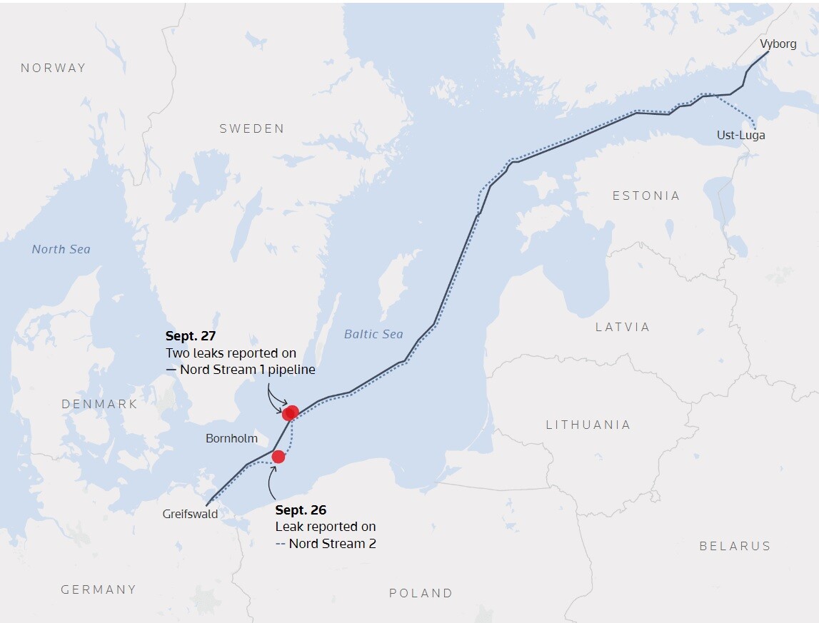 Σύμφωνα με τα μέχρι τώρα δεδομένα ένα ζεύγος εκρήξεων φέρεται να έχει προκαλέσει διαρροές σε τουλάχιστον τρία σημεία των υποθαλάσσιων αγωγών του Nord Stream που συνδέουν τη Ρωσία με τη Γερμανία, προκαλώντας αναταραχή στη θάλασσα με φυσαλίδες αερίου να διακρίνονται στις περιοχές όπου υπάρχουν διαρροές.