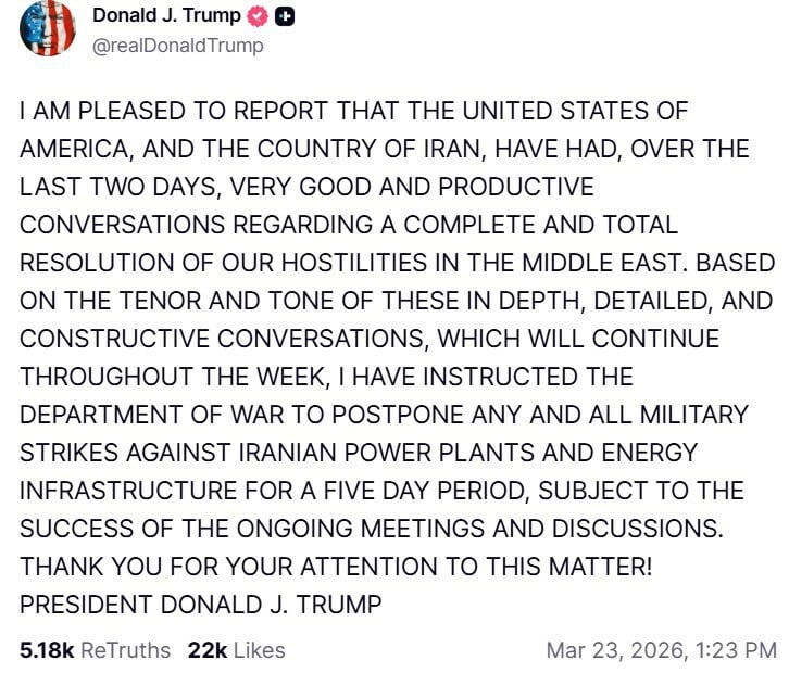 Με βάση το κλίμα και τον τόνο αυτών των σε βάθος, λεπτομερών και εποικοδομητικών συνομιλιών, οι οποίες θα συνεχιστούν καθ’ όλη τη διάρκεια της εβδομάδας, έδωσα εντολή στο Υπουργείο Πολέμου να αναβάλει οποιαδήποτε και κάθε στρατιωτική επίθεση κατά ιρανικών ενεργειακών εγκαταστάσεων και υποδομών για περίοδο πέντε ημερών, υπό την προϋπόθεση της επιτυχίας των συνεχιζόμενων συναντήσεων και διαπραγματεύσεων.